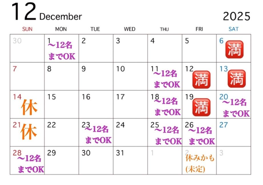 約1ヶ月前【12月の空席状況|12/2時点】